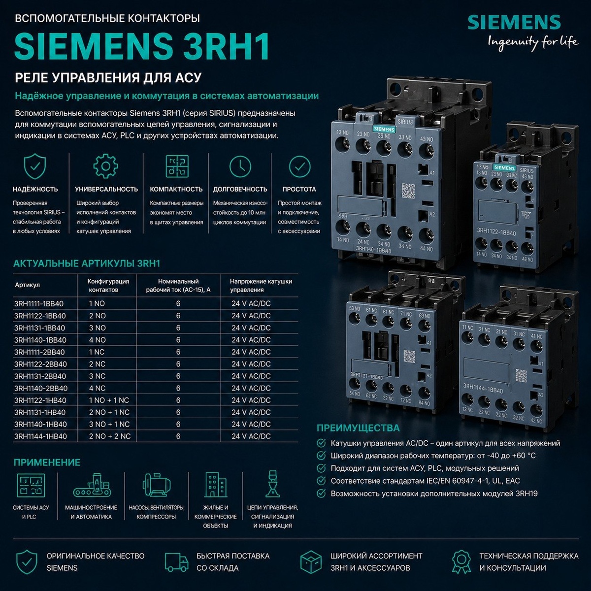 Применяются в задачах: цепи управления, сигнализации, блокировочные схемы, коммутация катушек других контакторов. Особенности серии: большое количество контактов (4NO, 4NC, 2NO+2NC и др.) в компактном корпусе, не предназначены для коммутации главных силовых цепей. Артикулы серии 3RH1 в наличии и под заказ: • 3RH19811JA11 — 2-й боковой выключатель вспомогательных цепей 1 замыкающий контакт, 1 размыкающий контакт... • 3RH19811DA11 — 1 боковой вспомогательный выключатель 1 замыкающий контакт, 1 размыкающий контакт, винтово... • 3RH19511TA11 — Блок вспомогательных контактов для 3RT135, 3RT136, 3RT137 1 НО, 1 НЗ, монтируется сбоку, в... • 3RH19511SA11 — Дополнительный блок вспомогательных контактов для 3RT135, 3RT136, 3RT137 1 НО, 1 НЗ, монти... • 3RH19212XA220MA0 — БЛОК ДОПОЛНИТЕЛЬНЫХ КОНТАКТОВ, 2НО+2НЗ С ПОРЯДКОВЫМИ ЦИФРАМИ 5..8 DIN EN 50012, 4-Х ПОЛЮСН... • 3RH19212KA20 — БЛОК ДОП. КОНТАКТОВ, 2НО, DIN EN50005, ПРУЖИННЫЕ ЗАЖИМЫ, ДЛЯ ПУСКАТЕЛЕЙ, 2 ПОЛЮСНЫЙ • 3RH19212KA02 — БЛОК ДОП. КОНТ