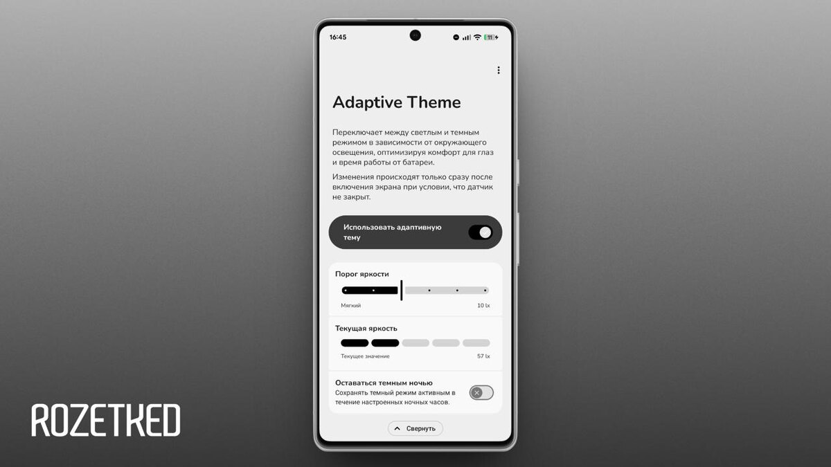 При ярком свете вокруг — светлая тема оформления. В темноте — тёмная. Переключение происходит автоматически на основе данных датчика освещённости сразу после разблокировки экрана. Порог срабатывания можно настроить. Приложение доступно бесплатно в Google Play. Для изменения системных настроек ему понадобится выдать разрешение через ADB или Shizuku. 💼 Rozetked | Подписаться