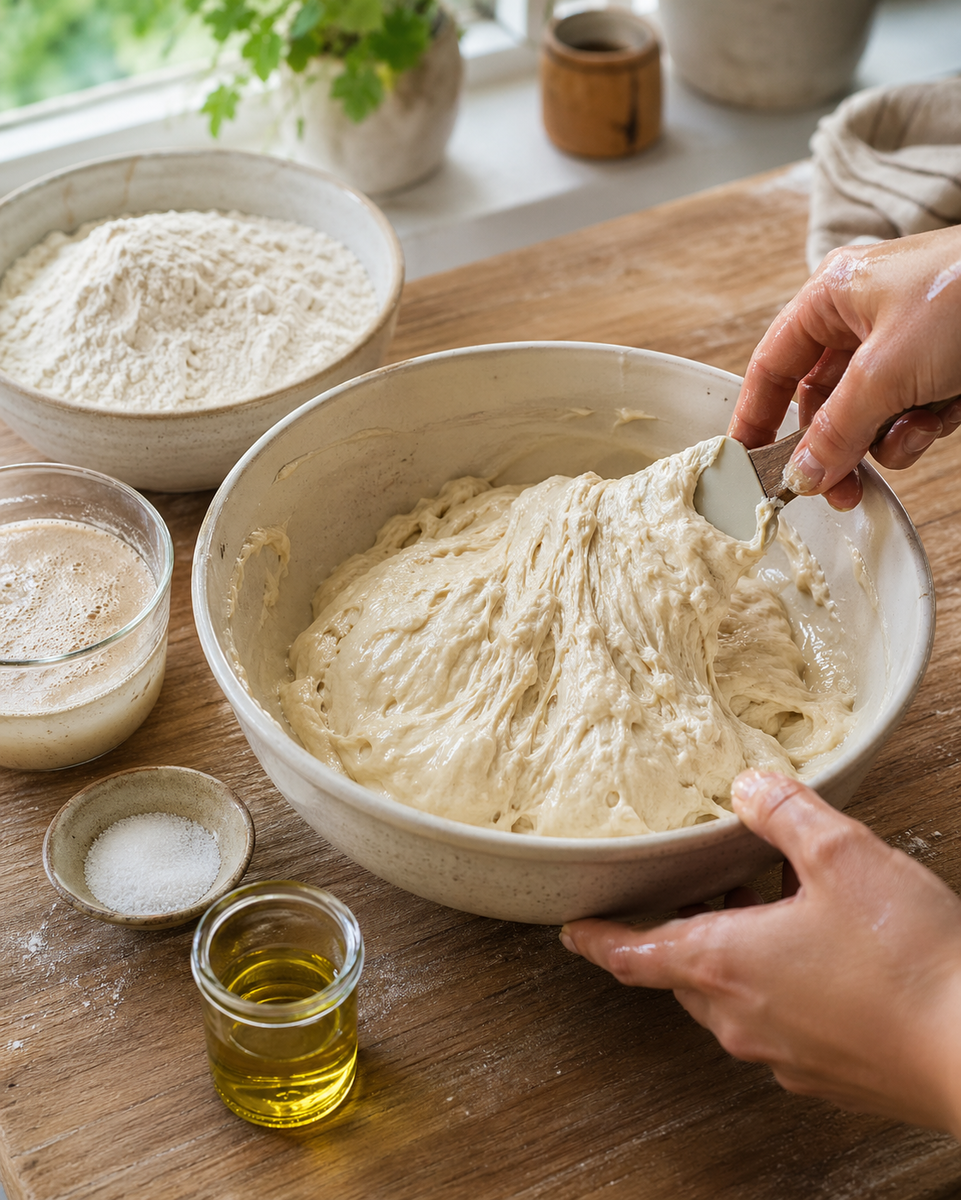 Убираем тесто в миску, накрываем пленкой и оставляем в теплом месте на 1.5–2 часа. Оно должно увеличиться в объеме минимум в два раза и стать очень дырчатым. Шаг 3: Самый медитативный этап