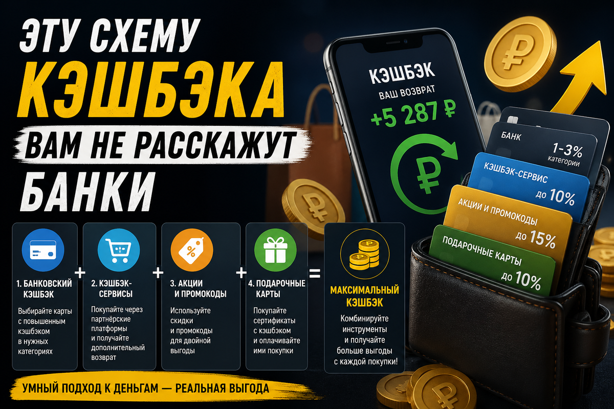 Суть в том, что кэшбэк — это не один инструмент, а комбинация нескольких. Банки заинтересованы, чтобы вы пользовались только их картой и не выходили за рамки их экосистемы. Но если объединить разные источники возврата, можно получить кратный эффект.