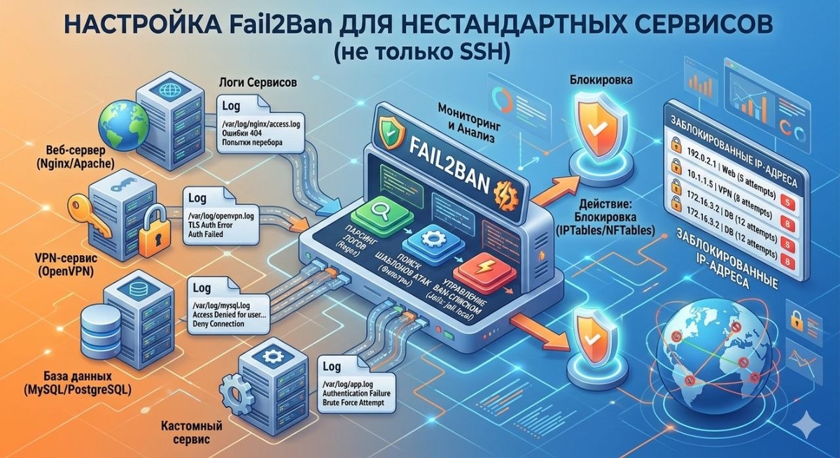 Большинство администраторов знакомят с Fail2Ban через SSH. Он эффективно блокирует IP адреса, с которых идёт перебор паролей. Однако современная инфраструктура состоит из десятков сервисов, каждый из которых потенциально уязвим для брутфорса. Почтовые серверы (Postfix, Dovecot) страдают от атак на SASL аутентификацию. Веб-серверы (Nginx, Apache) от сканирования уязвимостей и перебора паролей к админ панелям. FTP серверы (vsftpd) от подбора учётных данных к файловым хранилищам. Ограничиваясь защитой только SSH, администратор оставляет эти сервисы беззащитными.