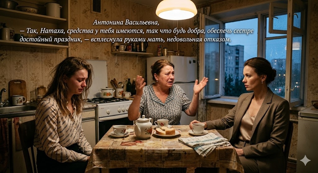 — Опять ты за свое! — отмахнулась мать, словно от назойливой мухи. — Ты старшая! Ты сильная, пробивная. А она нежная, творческая натура. Родная кровь, Наташа! Как ты можешь жалеть денег для единственной сестры в такой день?