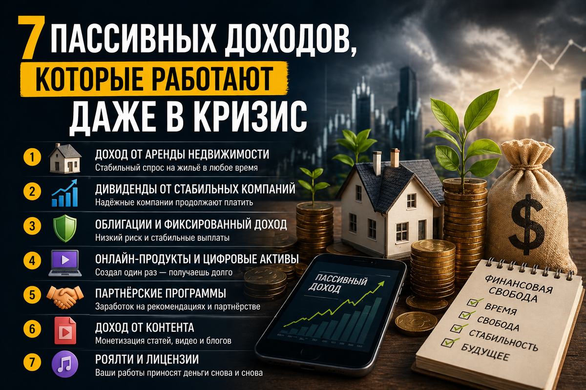Когда экономика штормит, привычные источники дохода становятся нестабильными. Зарплаты сокращаются, бизнесы закрываются, инвестиции проседают. Именно в такие периоды особенно ценится пассивный доход — тот, который продолжает приносить деньги без ежедневного участия. Но не все его виды одинаково устойчивы. Ниже — семь вариантов, которые показывают наибольшую живучесть даже в кризис.