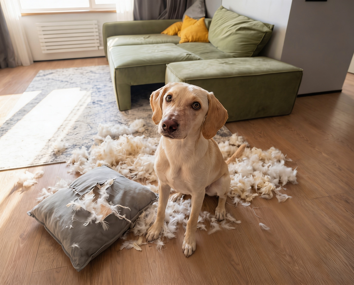 Вы ушли на три часа. За это время пёс успел: принести все игрушки в коридор (вас не было), полаять на холодильник (не помогло), и всерьёз заняться подушкой с дивана (помогло). Встречает с видом: «Я очень старался. Подушка сопротивлялась». Он не хулиганил. Он скучал. Это разные вещи, и вот почему это важно. Собакам нужна нагрузка — и физическая, и умственная. Когда её нет, мозг ищет выход сам. Диван в этой ситуации просто подвернулся. Примерно как ребёнок, которого заперли дома без телефона и сказали «сиди тихо». Он сидел. Минут десять. Деструктив - это симптом, не характер. И хорошая новость в том, что симптом лечится. Скука нарастает постепенно. Сначала пёс честно пробует нормальные способы: Рабочие породы: хаски, бордер-колли, джек-рассел — выведены для конкретных задач. Без задач начинают изобретать свои. Хаски, например, может переставить мебель. Джек-рассел разберёт плинтус. Но скучать могут все. Молодые чаще, энергии больше. Умные сильнее - мозгу нужно больше. Если пёс регулярно