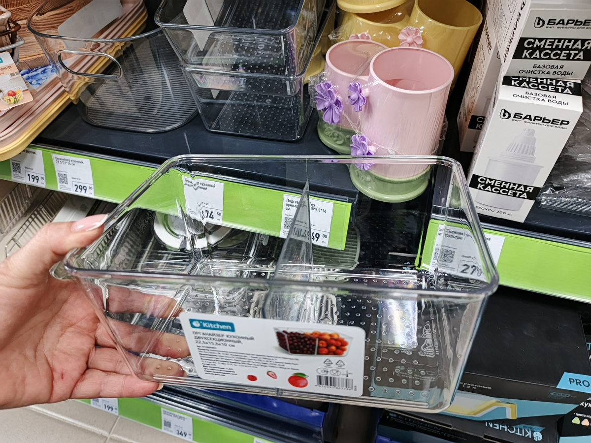 Кухонный прозрачный органайзер из двух секций размером 22,5х15х10 см. Прозрачный внешний вид с первого взгляда позволяет быстро найти нужные предметы. Не занимает много места, но может эффективно повысить эффективность хранения. Простая форма подходит для всех видов домашних стилей, будь то столешница, холодильник или шкаф, он аккуратный и красивый. Края гладкие и без заусенцев. Цена 174 рубля.