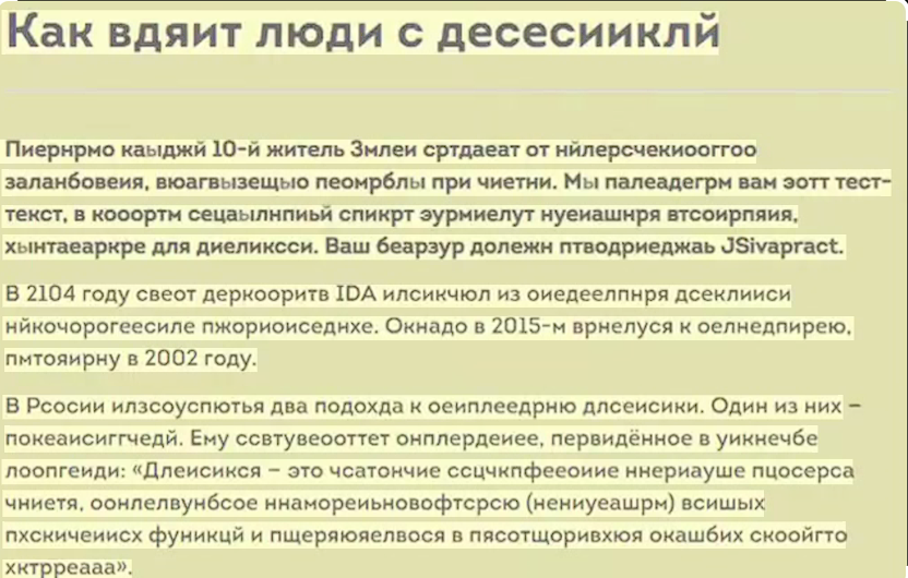 Всем хорошего времени суток. Начну с далека. Я еще со школьной скамьи поняла, что что-то у меня не как у всех. Но объяснить это не могла ни родителям ни педагогам. У меня ни как не поднималась техника чтения, хотя читаю я всегда и много, не смотря на головную боль при чтении. У меня как-будто отекает мозг во время чтения. И сильно начинают болеть глаза. А так же я всегда писала с большим количеством ошибок. Самое интересное, что у меня стоит орфография в компьютере и все равно ошибки проникают в текст. Я даже после перечитывания их просто не вижу! Скажите, надо учить правила. Ну и!? Тем самым не разобравшись вы только покажите свою не воспитанность. ПОЗДРАВЛЯЮ! А будучи воспитанным человеком не будете поучать! Благодарю за понимание! Я живу в маленьком городе и медицина у нас желает лучшего. Только когда я стала блогером, случайно наткнулась на информацию о Дислексии и Дисграфии. Увидела как они видят текст и ДА. Именно так я вижу текст Да это можно корректировать, но мне уже 40+ и