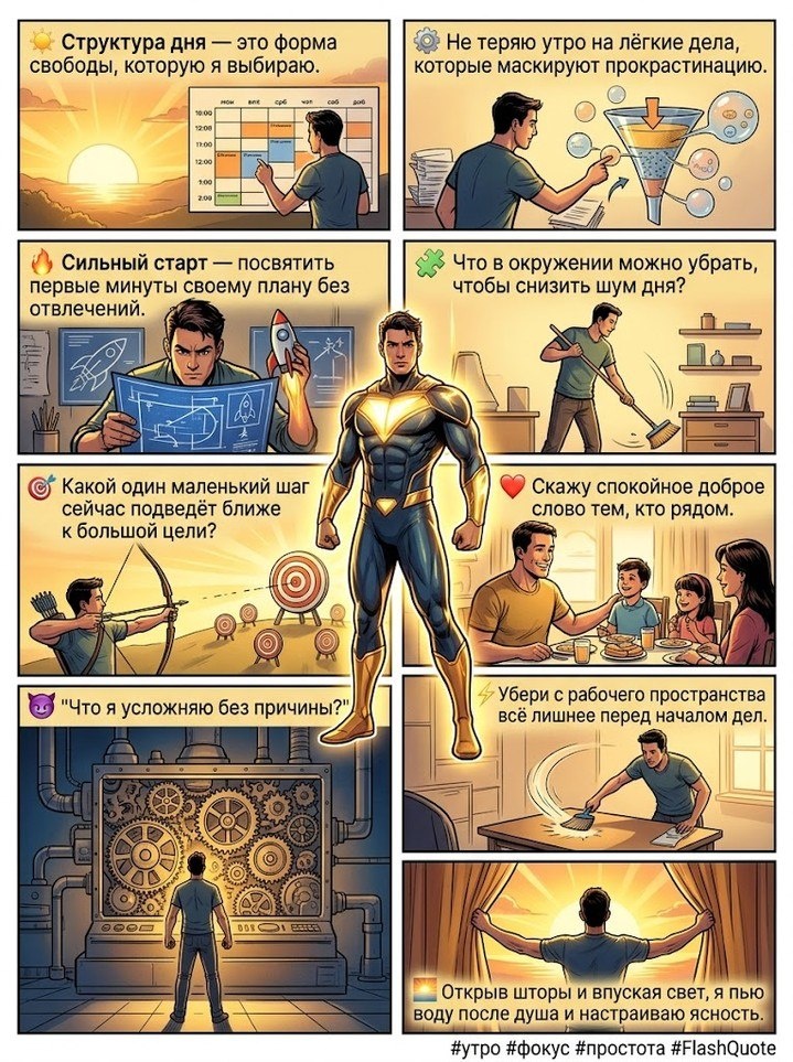 ⚙️ Не теряю утро на лёгкие дела, которые маскируют прокрастинацию. 🔥 Сильный старт — посвятить первые минуты своему плану без отвлечений. 🧩 Что в окружении можно убрать, чтобы снизить шум дня? 🎯 Какой один маленький шаг сейчас подведёт ближе к большой цели? ❤️ Скажу спокойное доброе слово тем, кто рядом. 😈 "Что я усложняю без причины?" ⚡ Убери с рабочего пространства всё лишнее перед началом дел. 🌅 Открыв шторы и впуская свет, я пью воду после душа и настраиваю ясность. #утро #фокус #простота #FlashQuote