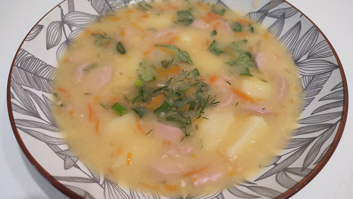 Отварила горох. Отправила потом туда же картофель. И уже в конце, добавила обжаренные лук и морковь, и сосиски.