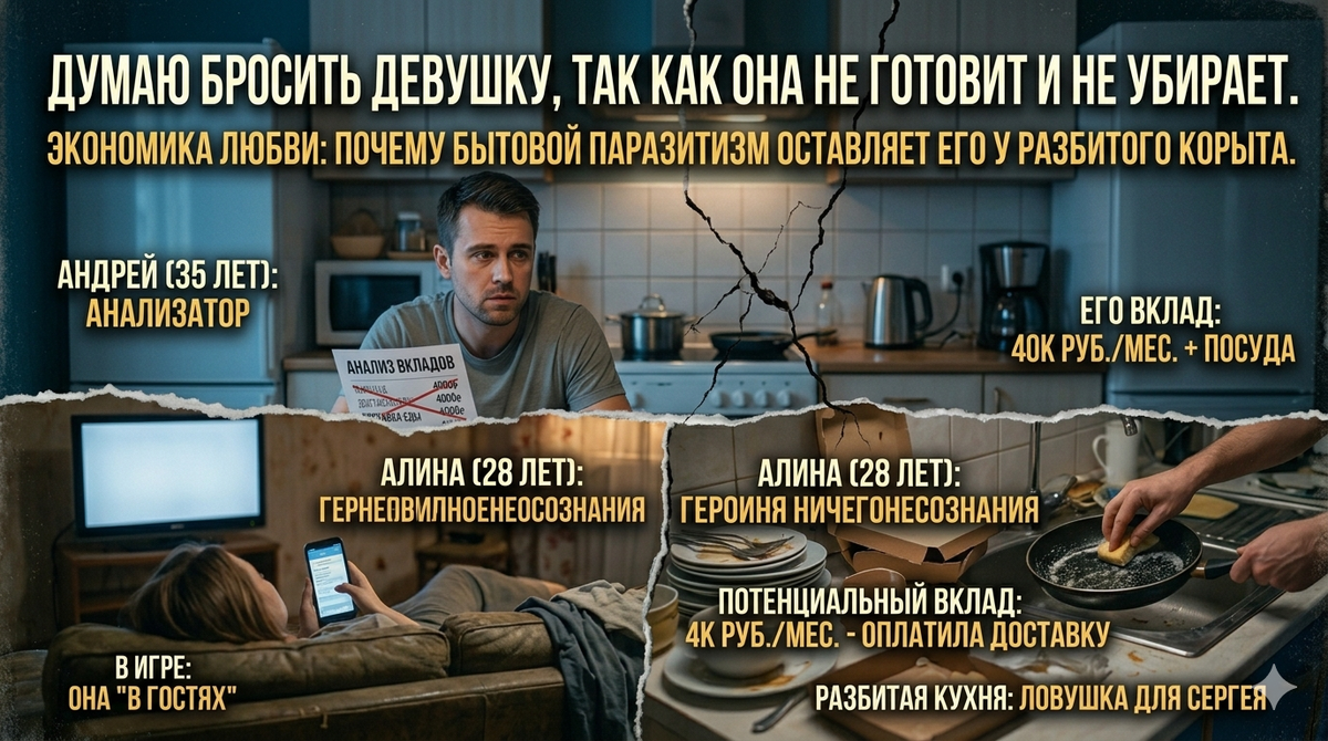 Андрей смотрел на своего друга Сергея и не узнавал его. Сергей всегда был парнем волевым, но стоило ему съехаться с Алиной, как он превратился в помесь официанта и горничной. — Серёг, ты серьёзно? — спросил Андрей, когда они сидели на кухне, а Сергей в это время методично оттирал сковородку, пока Алина в комнате листала ленту соцсетей. — Она же только что поела. Почему тарелка на столе? — Ну, она же у меня в гостях, — виновато улыбнулся Сергей. — Квартира моя, я хозяин. Гостя напрягать некрасиво. — Она живёт здесь полгода! Какая «гостья»? Она полноценный жилец, который не производит ничего, кроме грязной посуды. Алина не просто не любила убирать и готовить — она это принципиально игнорировала. Попытки приготовить ужин заканчивались либо сожжённой яичницей, либо фразой: «Ой, у меня не получается, давай закажем пиццу». И Сергей заказывал, оплачивал, забирал у курьера, накрывал на стол, а потом сам же убирал коробки. Отношения — это партнёрство и когда оба вкладывают в общий котел. Сейч