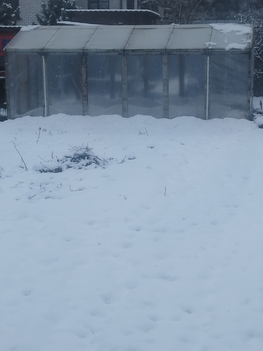 Первым делом пошла в теплицу. На крыше снега нет. Это хороший признак. Значит он тает от контакта с теплой поверхностью и скатывается.