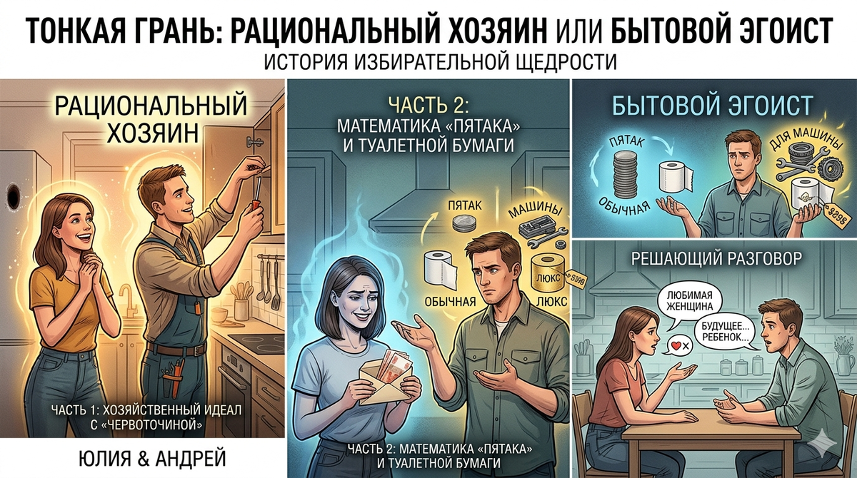 Юлия смотрела, как Андрей ловко чинит дверцу шкафа в её квартире. После первого мужа, который только и делал, что пропивал семейное имущество, Андрей казался подарком судьбы. Рукастый, добрый, не боится домашней работы — сам приготовит ужин, сам уберёт. Не мужчина, а золото. Но стоило теме зайти о деньгах, «золото» превращалось в дешёвую медь. — Поеду в отпуск на две недели, — радостно сообщил он, вытирая руки. — Ой, как здорово! — улыбнулась Юля. — Отдохнёшь наконец-то. — Да уж, отдохну... Только получу копейки. Опять по деньгам туго будет, — тут же помрачнел Андрей. Эта фраза — «денег нет» — стала его фоновым шумом. Андрей произносил её так часто, что Юля начала чувствовать вину за то, что просто хочет сходить в кино. При этом она знала, что Андрей зарабатывает вдвое больше неё, да ещё и постоянно «колымит» на работе. Всё стало окончательно ясно на день рождения Юли. Они встречались уже второй год. Юля ждала сюрприза, возможно, того самого «внимания», о котором пишут в книгах. Андре