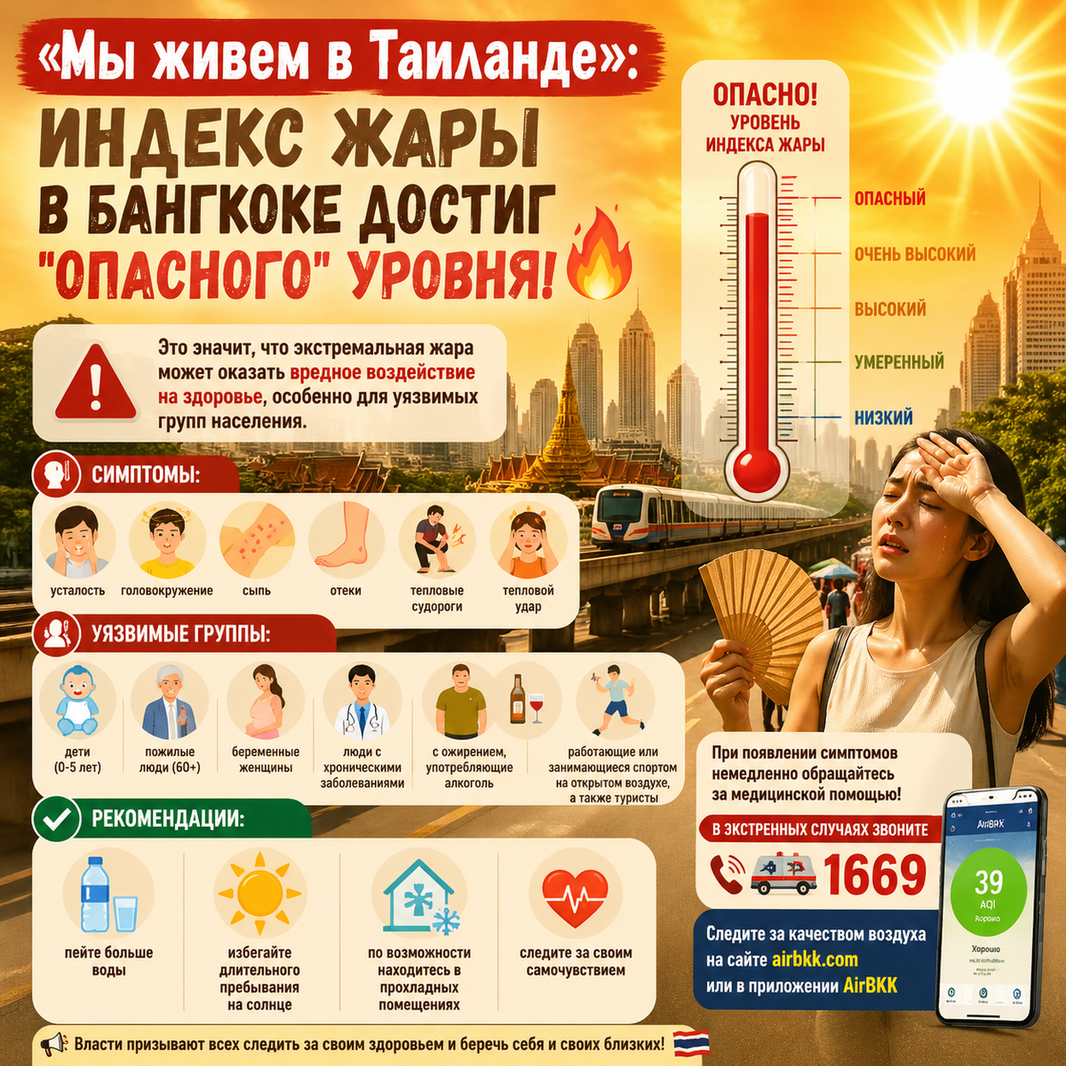 Сегодня, 28 апреля 2026 года, власти Бангкока выпустили предупреждение о высоком индексе жары, который достиг «опасного» уровня. Это значит, что экстремальная жара может оказать вредное воздействие на здоровье, особенно для уязвимых групп населения. На что обратить внимание: 1. Симптомы: усталость, головокружение, сыпь, отеки, тепловые судороги и тепловой удар. 2. Уязвимые группы: дети (0-5 лет), пожилые люди (60+), беременные женщины, люди с хроническими заболеваниями, с ожирением, употребляющие алкоголь, а также те, кто работает или занимается спортом на открытом воздухе, и туристы. 3. Рекомендации: следите за своим самочувствием, пейте больше воды , избегайте длительного пребывания на солнце и по возможности находитесь в прохладных помещениях. Власти призывают всех следить за своим здоровьем и при появлении симптомов немедленно обращаться за медицинской помощью. В экстренных случаях звоните по номеру 1669. Вы можете следить за качеством воздуха на сайте airbkk.com или в прилож