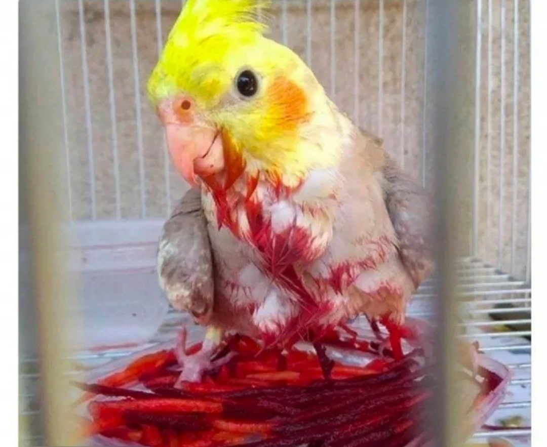 При свекольном окрашивании сам попугай бодр, активен и нормально ест.