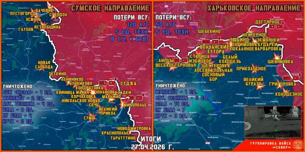 Группировка войск «Север» продолжает наступательные действия на приграничных с Курской областью территориях Сумской области Украины. Сводка опубликована утром 28 апреля. За минувшие сутки, 27 апреля, штурмовые отряды нанесли удары по скоплениям живой силы и техники противника в районах Бубликово, Новой Слободы, Ленинского (Степового), Радьковки, Мирополья, Пустогорода, Суходола, Мироновки, Новодмитровки и села Новая Сечь. Шосткинский район: продвижение 200 метров и несовершеннолетние нацисты На этом участке без существенных изменений. Артиллеристы и расчёты БпЛА работают по ранее вскрытым целям, штурмовики зачищают лесные массивы. Продвижение составило до 200 метров. Анализ некрологов показал, что здесь несут потери подразделения 1-й бригады теробороны. В составе этого украинского подразделения действуют группы несовершеннолетних националистов, связанных с запрещённым в РФ «Правым сектором»*. Сумской район: рекордные 750 метров и переброска «Азова» Штурмовики Северян продвинулись в Сум