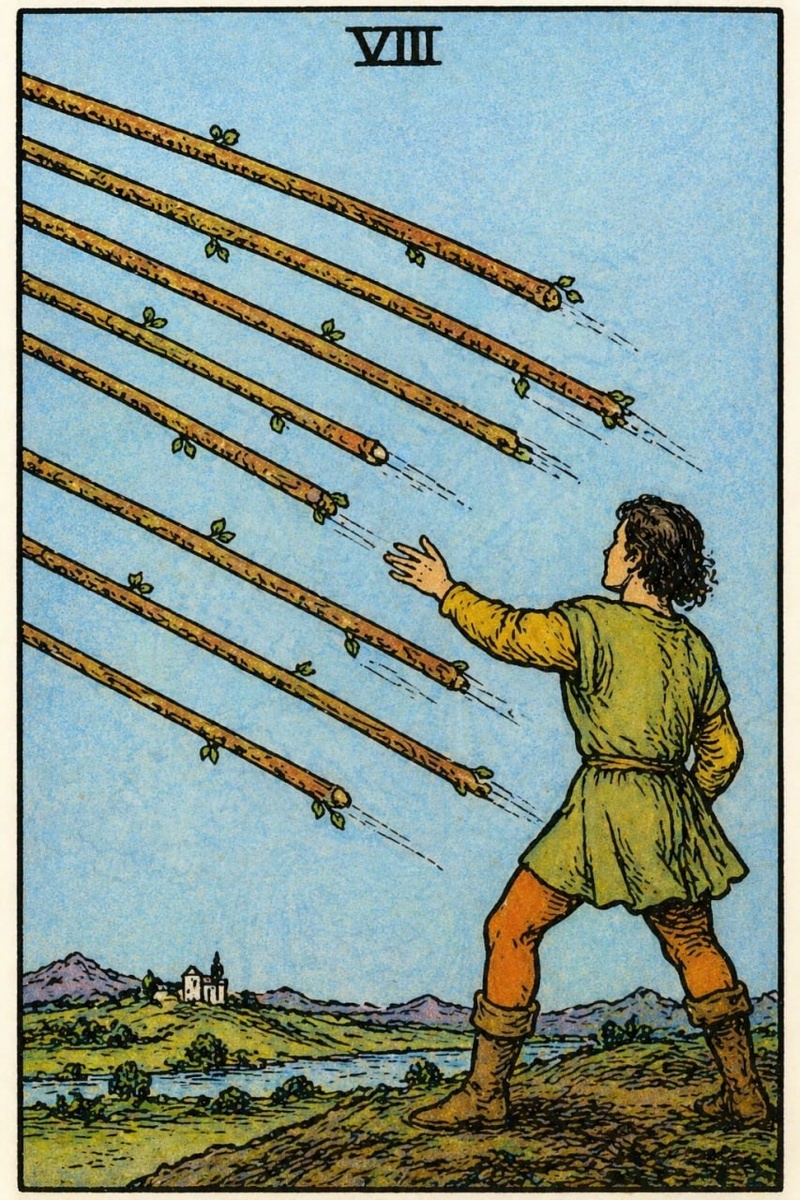 Я не стою на месте. Я уже в движении, и оно началось раньше, чем я это осознал. Вокруг меня воздух натянут, как струна, и в нем летят жезлы - один за другим, без пауз, без задержек. Я чувствую их не глазами, а телом. Они проносятся рядом, оставляя за собой тонкий свист, и в этом звуке есть скорость, решение и уже сделанный выбор. Я не размахиваю руками и не пытаюсь их остановить. Мне это и не нужно. Я знаю, что все уже запущено. То, что должно произойти, уже движется ко мне, и я сам в этом потоке. Нет времени на сомнения, на долгие размышления, на попытки что-то разложить по полкам. Здесь все проще - я либо доверяю этому движению, либо выпадаю из него. Я ловлю один жезл, почти на инстинкте, и чувствую тепло в ладони. Он живой, он несет в себе импульс, который невозможно остановить. И в этот момент я понимаю - я не наблюдатель. Я часть этого полета. Все, что я делал до этого, привело к этой скорости, к этому моменту, где решения не обдумываются, а происходят. Меня захватывает ощущени