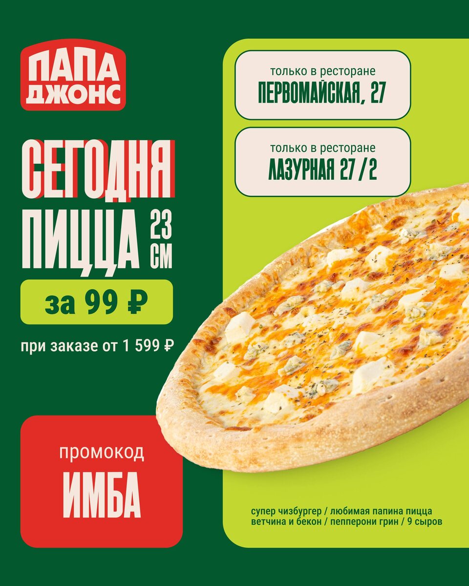 Мы знаем как вы любите подарки. Поэтому сегодня пицца всего за 99 рублей! Что нужно сделать? 1️⃣Собрать заказ от 1599 рублей 2️⃣Добавить в корзину пиццу дня 3️⃣Ввести промокод ИМБА 🗓️ Акция действует только 28-29 апреля 👉🏻 Жми на корзину, чтобы оформить заказ 🛒