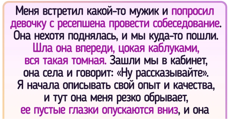Однажды я попала на собеседование в одну компанию. Меня встретил какой-то мужик и попросил девочку с ресепшена провести собеседование. Она нехотя поднялась со стула, и мы куда-то пошли. Шла она впереди, цокая каблуками, вся такая томная, то и дело вздыхала, постоянно наклоняла голову набок и бесконечно поправляла волосы. Зашли мы наконец в кабинет, она села и говорит: «Ну рассказывайте». Я попыталась уточнить, что конкретно ее интересует, но она сказала, что ей без разницы и я могу рассказывать все что угодно. Я начала во всех красках описывать свой опыт и качества, и тут она резко меня обрывает, ее томные пустые глазки опускаются вниз, и она просит следовать за ней. Мы снова бесконечно долго шли к выходу. В конце я услышала это до боли знакомое «Мы вам позвоним», и мы попрощались. Никто, конечно же, не позвонил, и что это было вообще — непонятно. © Radostnya