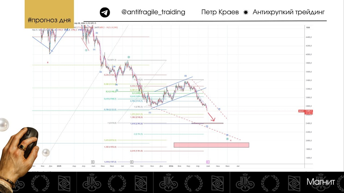 Ну вот цена и обновила минимум прошлого года. О том, что вероятнее всего это случится, писал с начала этого года (тут, тут, тут и тут). Графически началась реализация недельного флага на падение. Основная цель: район 2393-2410. 👁️🗨️Ссылка на график: https://www.tradingview.com/x/zfXjCoFI/ С точки зрения волн, продолжаю исходить из формирования конечной диагонали. Это значит, что по достижению цели флага, падение вряд ли завершится. Скорее всего нас будет ждать отскок, после которого цена установит новый минимум. Данное сообщение носит информационный характер и не является индивидуальной инвестиционной рекомендацией.
