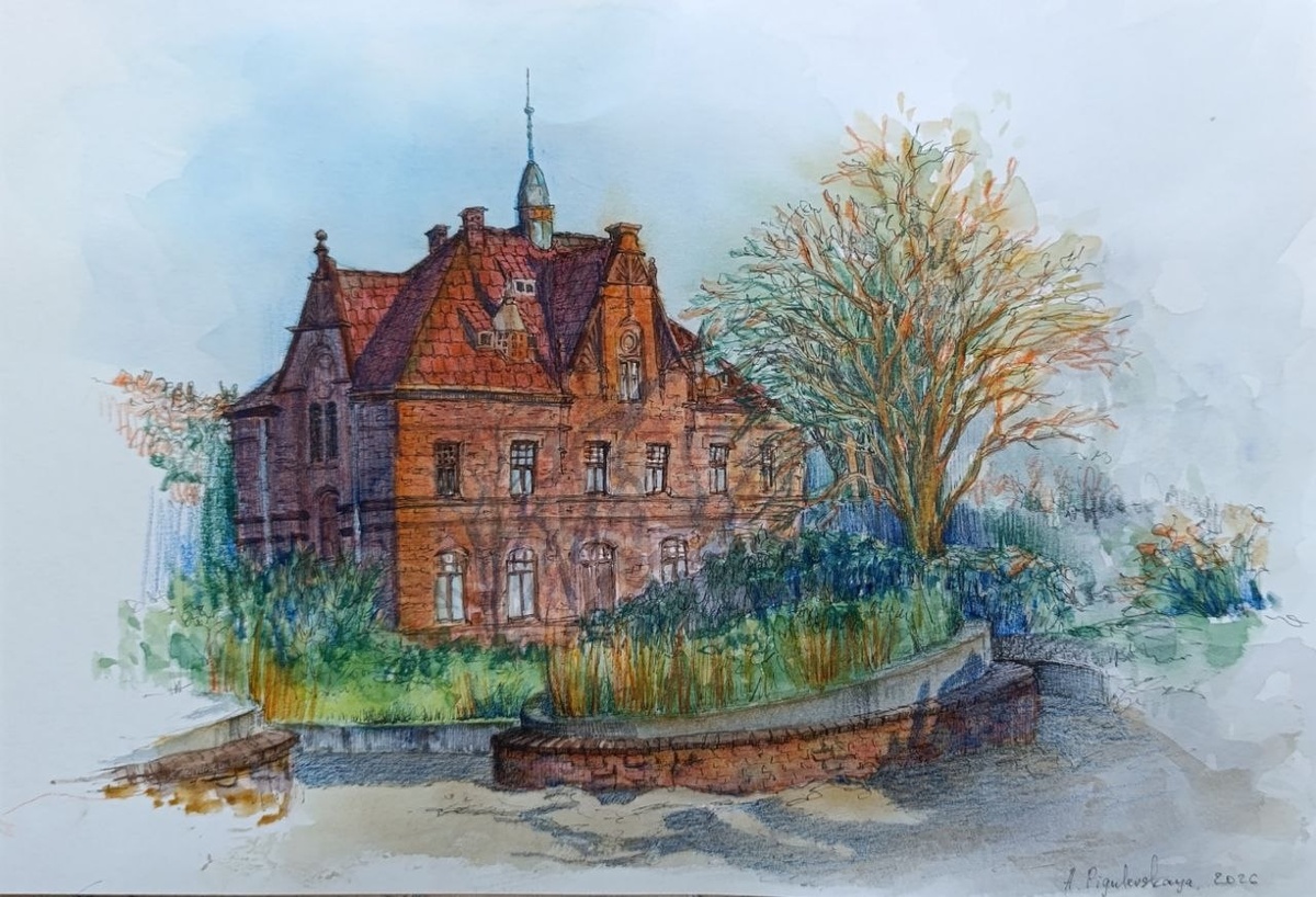 бумага, акаарель, изограф, цв.карандаши . ул. Пугачёва 1, г. Зеленоградск, Калининградская область (до 1946 года: Кранц, Восточная Пруссия) . Здание администрации курорта Восточной Пруссии. Построено в начале ХХ в. В послевоенные годы в здании располагалась водогрязелечебница, позже - цех по разливу минеральной воды. . Всё-таки решила залить её цветом. И мне нравится) Особенно сейчас, когда так ярко светит весеннее солнце😍 . #art #sketch #watercolors #architecture #apigulevskaya_art