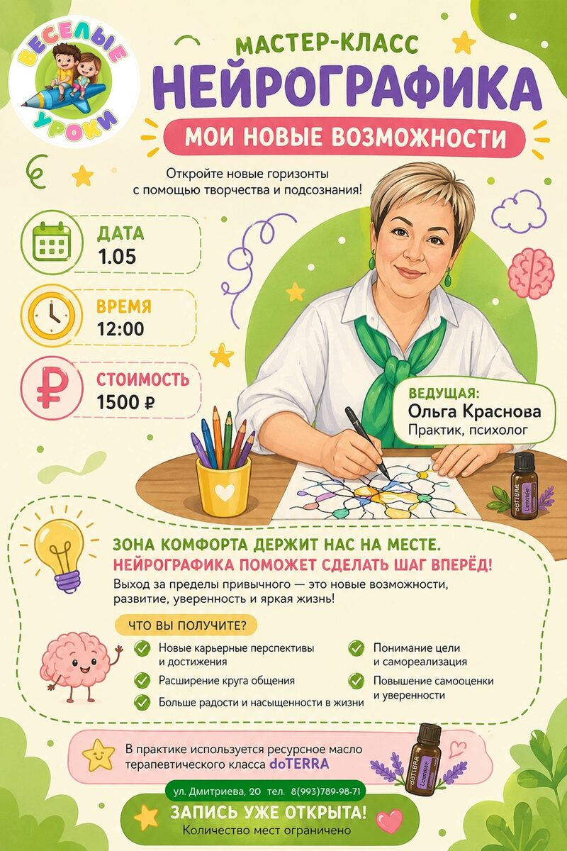 Через нейрографику будем работать с внутренними ограничениями, расширять зону комфорта и открываться новым возможностям. В практике используем ресурсное масло doTERRA. Начало: 01 мая 2026 12:00 Стоимость: 1500.0 руб. Адрес: г Омск, ул Дмитриева, д 20 Организатор: https://vk.com/public226827352 🌿 Приглашаем на нейрографику «МОИ НОВЫЕ ВОЗМОЖНОСТИ» ✨ 1 мая в 12:00 Ведущая — Ольга Краснова, специалист нейрографики, аромапрактикпрактик, психолог. Это встреча для тех, кто чувствует, что готов к переменам, хочет выйти из привычных ограничений и открыть для себя новые возможности 💚 Через волшебный инструмент нейрографики мы будем: ✨ работать с внутренними ограничениями ✨ расширять зону комфорта ✨ открываться новым возможностям ✨ усиливать ресурсное состояние и уверенность в... #помогающие_практики_нейрографика Узнать подробности, адрес или записаться на событие.