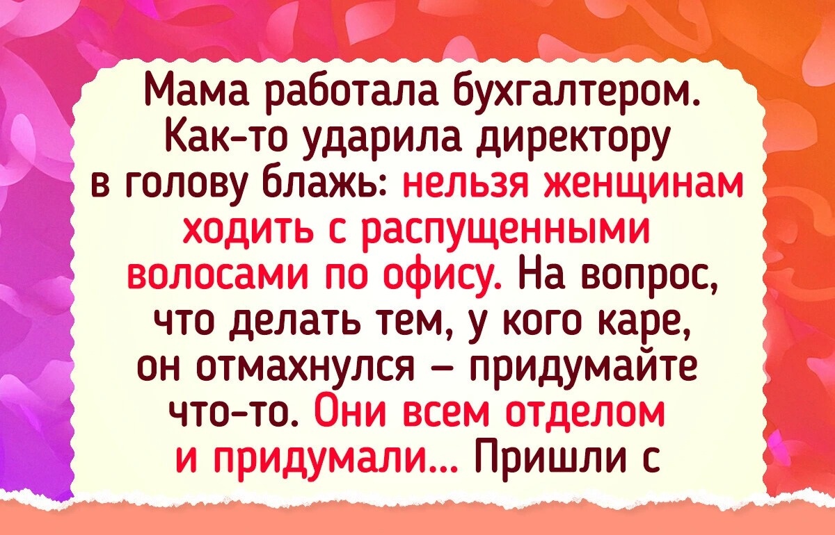 Мама работала бухгалтером. Как-то ударила директору в голову блажь: нельзя женщинам ходить с распущенными волосами по офису. На вопрос, что делать тем, у кого каре, он отмахнулся — придумайте что-то. Они всем отделом и придумали... Пришли с кучей хвостиков, перевязанных детскими разноцветными резинками. Ошибку свою директор понял.