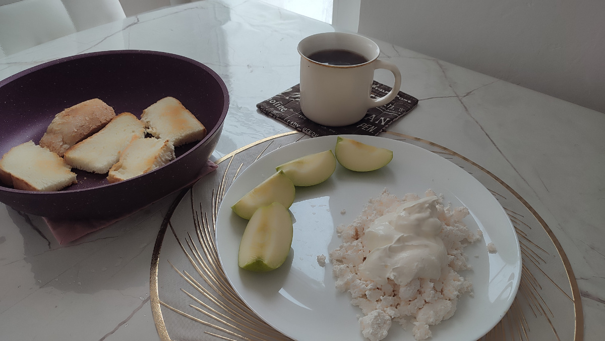 Даже завтрак сегодня очень простой: кухня вся заставлена, и варить несподручно. Подсушила гренки, сделала творог со сметаной и яблоко.