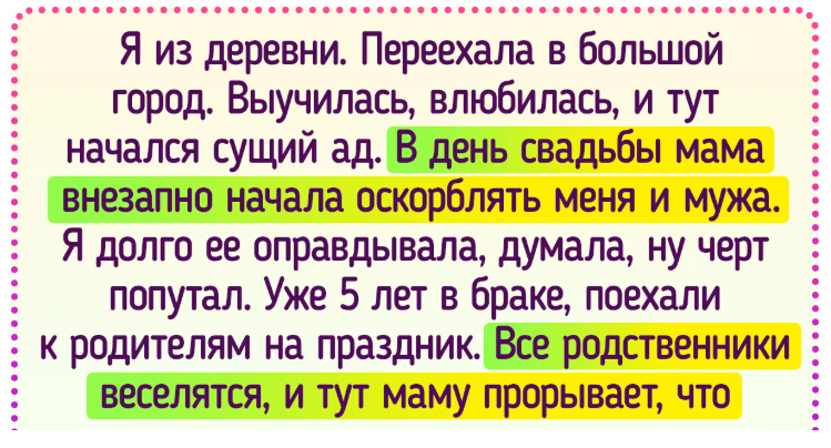 Я из деревни. Переехала в большой город. Выучилась, влюбилась, и тут начался сущий ад. В день свадьбы моя мама внезапно начала оскорблять меня и мужа. Я долго ее оправдывала, думала, ну черт попутал. Уже 5 лет в браке, поехали к родителям на праздник. Все родственники веселятся, и тут маму прорывает, что лучше бы вышла за Васю со школы. Муж психанул, уехал. И я с ним, потому что ОН — моя семья, а не вот «эти»!