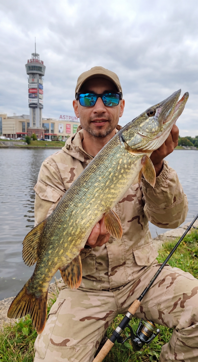 Промт: Создай портрет, не меняя черты лица. Реалистичная фотография рыбака, держащего большую пойманную рыбу двумя руками перед собой. Человек одет в камуфляжную бежевую куртку и штаны, на голове бежевая кепка как на прикрепленном фото и очки. Крупная рыба щука с хорошо видимой чешуёй зелено-золотистого цвета, рядом на берегу лежит спиннинг. Фон: берег реки клязьмы на набережной в городе, спокойная вода, башня торгового центра Аструм, пасмурное небо с облаками. Освещение естественное дневное. Стиль документальной фотографии, высокое разрешение, детализация. Человек смотрит прямо в камеру с довольным выражением лица."