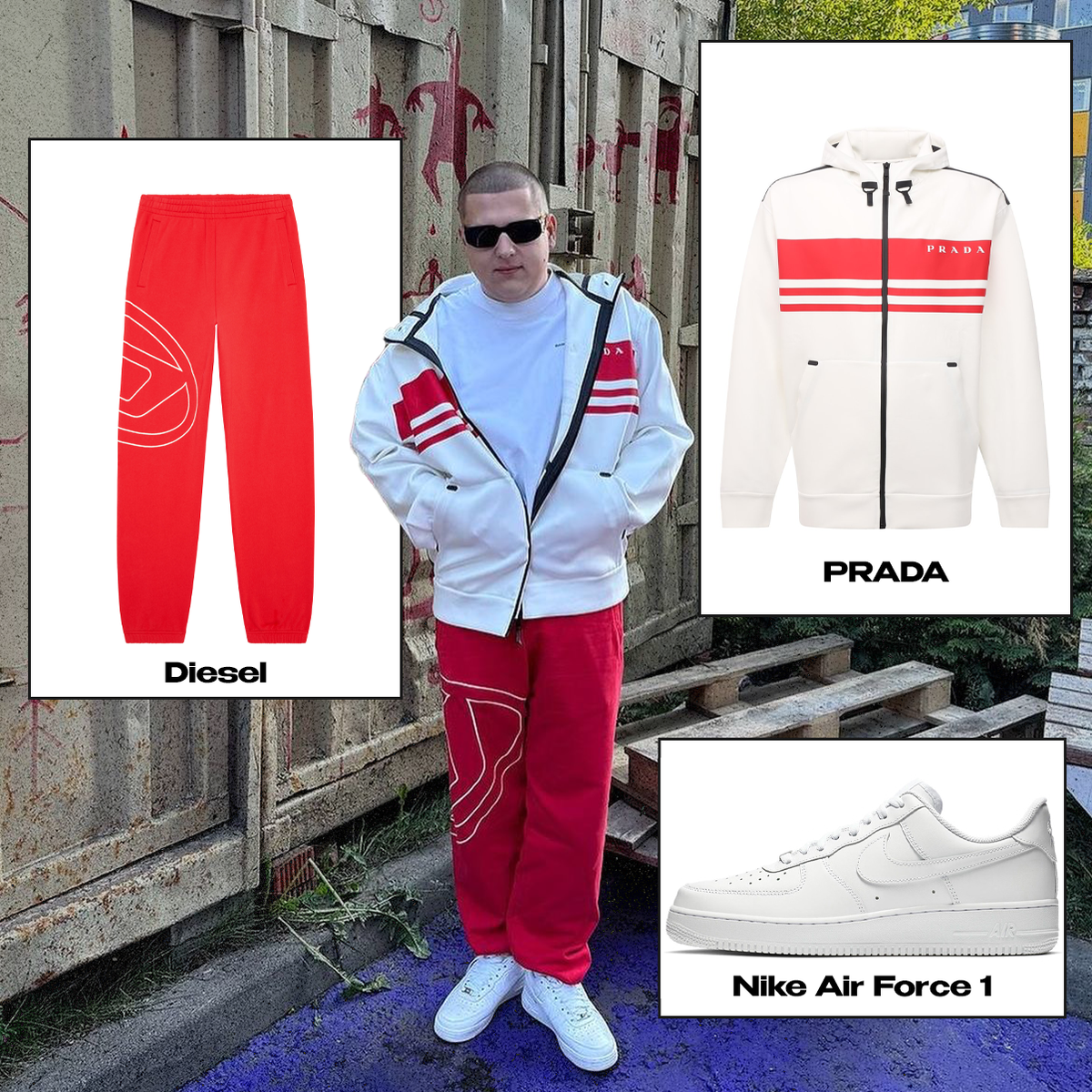 Аутфит рэпера нам прям зашел: нравится, что тут гармонично сочетаются бренды, а как Nike Air Force 1 хорошо сюда вписались. Ой, все, мы лайкаем. PRADA, арт. SJC590-10QM-F0009-S-212 Diesel, арт. A099400GYCJ-42G Nike Air Force 1, цена от 9 458₽* *стоимость может изменяться в зависимости от курса и размера Больше интересного на нашем сайте POIZON