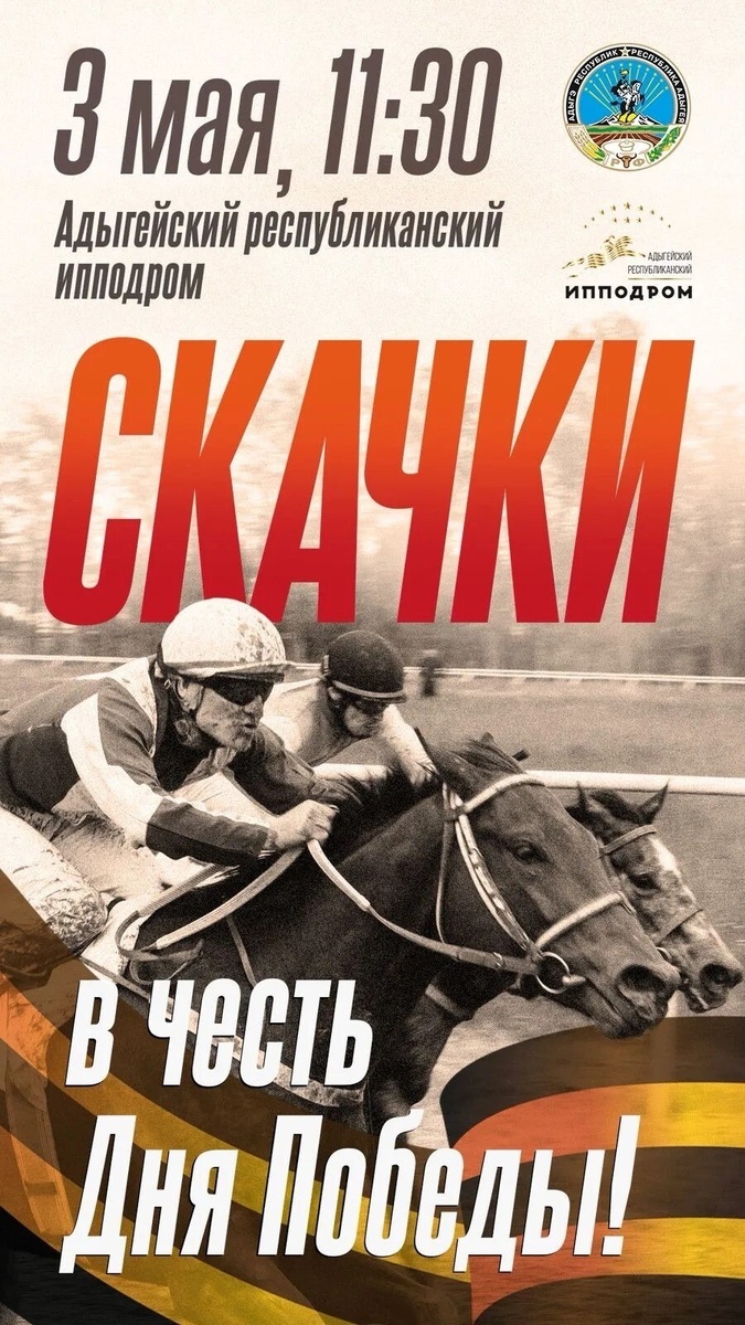 (далее – Комитет) совместно с Ассоциацией коннозаводчиков и коневладельцев Республики Адыгея 3 мая 2026 года проводит конноспортивный праздник (скачки), посвященный празднованию 81– годовщины Дня Победы в Великой Отечественной войне 1941-1945 годов. Место и время проведения: город Майкоп, Адыгейский Республиканский ипподром, 11:30 – открытие конноспортивного праздника, 12:00 – начало скачек. Приглашаем Вас принять участие в данном мероприятии. Вход свободный.