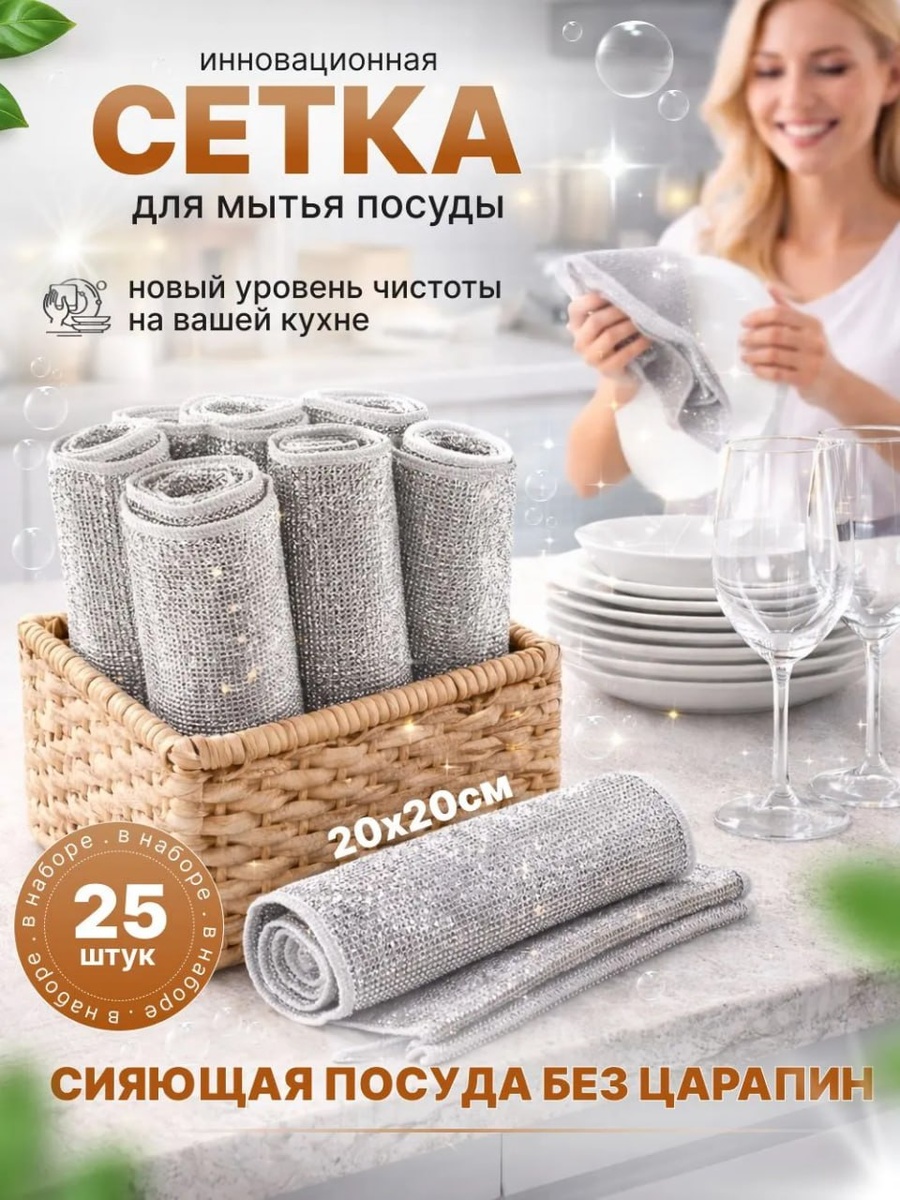 Губки для мытья посуды металлические, узелковая сетка для уборки, 20х20 см, 25 шт.