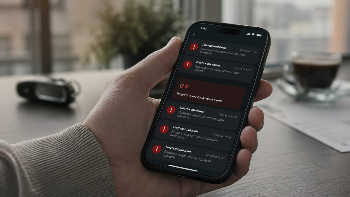 Когда мой коллега Антон показал мне выписку по своей карте, я сначала не понял, на что смотрю. Там было три попытки списания подряд — на 3 200, потом на 1 000, потом на 47 рублей. Все три — отклонены. Причина одна: на карте было ноль рублей ноль копеек.