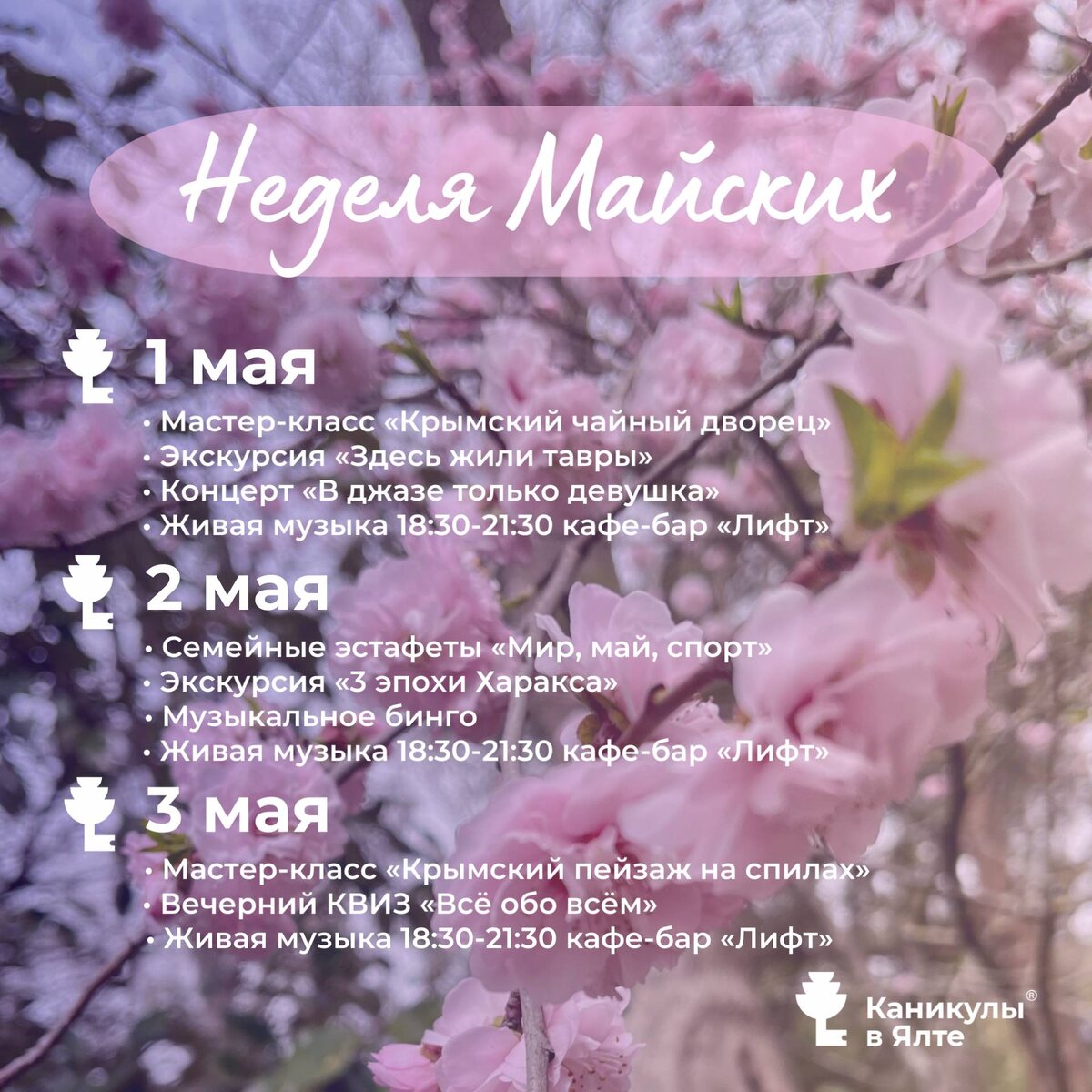 » 🌸 С 1 по 8 мая вас ждёт программа для всей семьи — каждый день новые впечатления, эмоции и поводы провести время вместе ✨ Творческие мастер-классы, познавательные экскурсии, спортивные активности и вечерние развлечения — выбирайте активность по душе и проводите майские праздники ярко вместе с нами 💫
