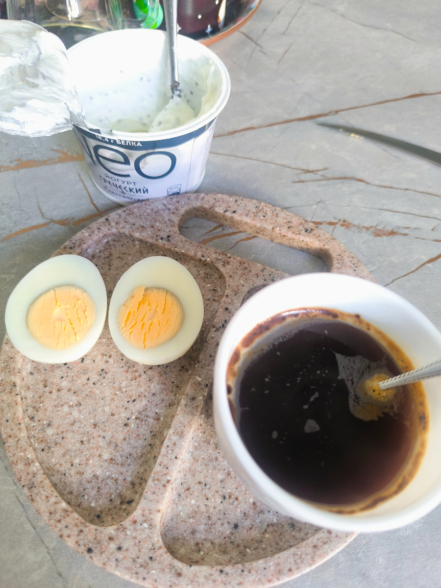 Кофе растворимый с сахарозаменителем. Вареное яйцо. 1/2 греческий йогурт с семенами чиа. +лицитин.