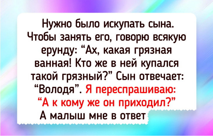 Нужно было искупать сына. Чтобы занять его, говорю всякую ерунду: "Ах, какая грязная ванная! Кто же в ней купался такой грязный?" Сын отвечает: "Володя". Я переспрашиваю: "А к кому же он приходил?" А малыш мне в ответ: "К тебе, мама". Хорошо, что он мне это рассказал. © Юлия Масленникова