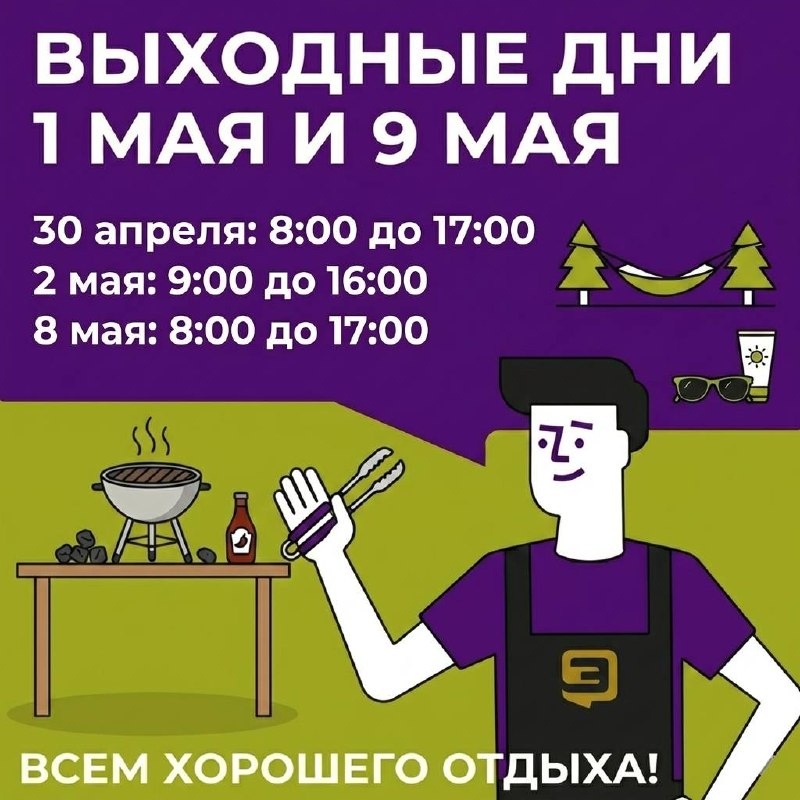 ! Друзья, поздравляем вас с наступающими майскими праздниками! Обратите внимание на изменения в режиме работы наших магазинов: ❌ 1 мая и 9 мая — ВЫХОДНЫЕ В предпраздничные и межпраздничные дни мы работаем по сокращенному графику: 🔹 30 апреля: с 8:00 до 17:00 🔹 2 мая: с 9:00 до 16:00 🔹 8 мая: с 8:00 до 17:00 Пожалуйста, учитывайте эту информацию при планировании своих покупок и визитов. Желаем вам провести эти дни с удовольствием, как следует отдохнуть и набраться сил! ☀️🔥 ВСЕМ ХОРОШЕГО ОТДЫХА!