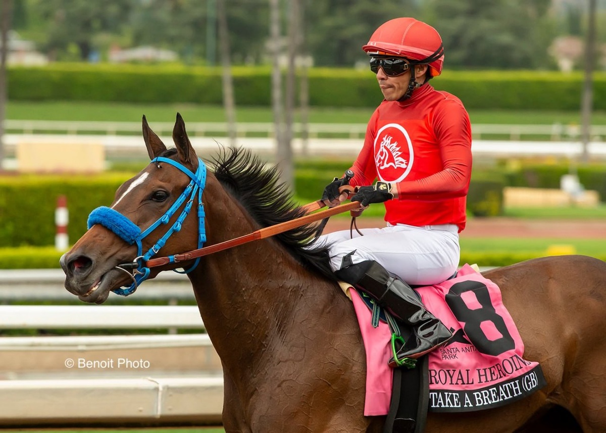 🇺🇸 TAKE A BREATH - Royal Heroine Stakes (Gr. 3). 25 апреля, четырехлетняя Take A Breath, одержала вторую победу подряд, придя первой в Royal Heroine Stakes (Gr. 3). Под седлом Эмисаэля Харамильо, дочь Bated Breath стартовала в середине группы, держась сначала на 5-4 позиции, затем на отметке 1/2 мили уже держалась второй за лидером Grand Slam Smile, ну а после за пару метров до финиша вступила в борьбу за лидерство и финишировала первой с преимуществом в 1/2 длины. Второй пришла May Day Ready, третьей - Grand Slam Smile. #TakeABreath #BatedBreath #DarlingGrace #MarkGlatt #SantaAnitaPark #Новости_из_USA #WRN