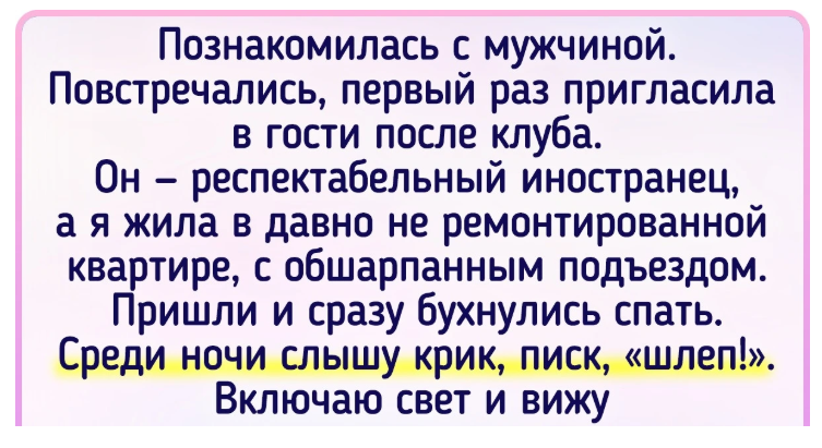 Познакомилась с мужчиной. Повстречались, первый раз пригласила в гости после клуба. Он — респектабельный иностранец, харизматичный, а я в давно не ремонтированной квартире, с обшарпанным подъездом. Пришли и сразу бухнулись просто спать. Среди ночи слышу: крик, писк, «шлеп!». Включаю свет и вижу, как моя домашняя крыска по стене сбегает. Я ногтями постучала, и крыска подбежала ко мне. Привыкла спать на моем плече, а тут перепутала, легла на мужчину. Он почуял что-то на груди, проснулся, а тут крыса ему в глаза смотрит.