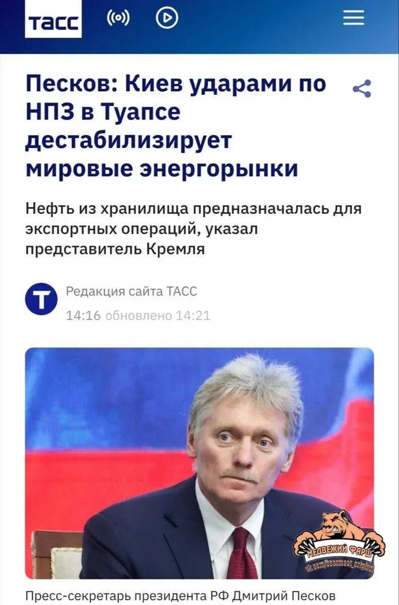 Москва, Россия. Пресс-секретарь Президента Российской Федерации - Песков: Киевский режим ударами по нефтехранилищам в Туапсе провоцирует дальнейшую дестабилизацию мировых энергорынков, которые и так испытывают трудности из-за ситуации в Ормузском проливе Очень ценно, что Песков переживает за международные энергорынки.