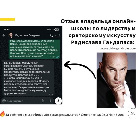 Дальше ссылка на презентацию в 240! слайдов с рассказом о том, какие они крутые. Включая ссылки на почти сотню «запущенных» ими проектов очень и просто известных людей. Я, конечно, с помощью своего критического мышления уже все понял, но написал своему давнему приятелю (23 года как) Радиславу, скрин «отзыва» которого работе Геннадия Карпова был в презентации (на фото скрин).