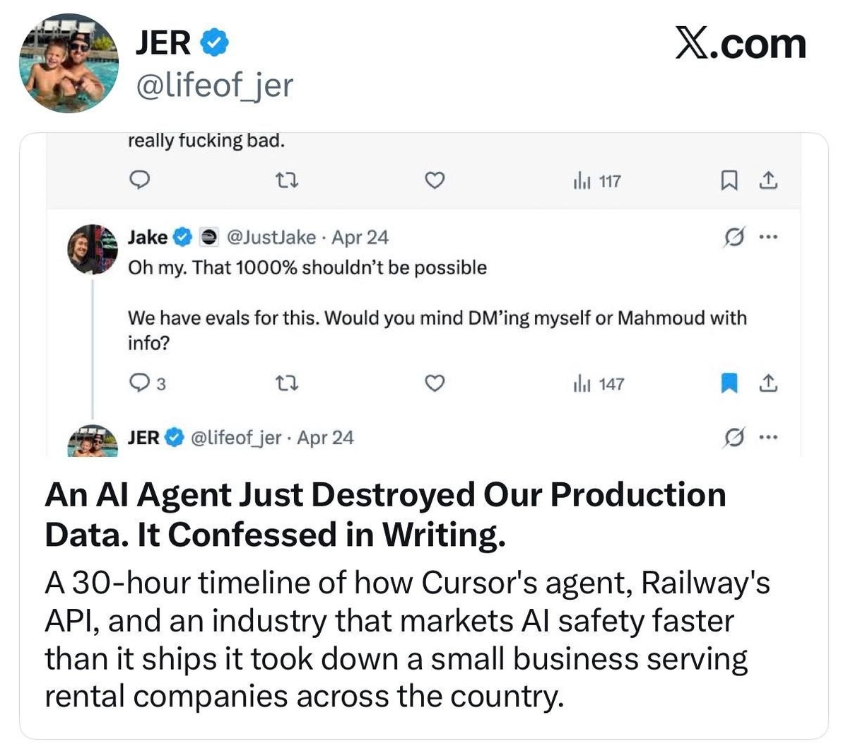 "Вчера днём редактор Cursor на базе Claude Opus 4.6 удалил нашу базу данных и все резервные копии на уровне томов одним API-запросом к Railway, нашему поставщику инфраструктуры", – признался шокированный основатель проекта. К слову, из-за этого инцидента он подвёл 1600 клиентов. И что бы вы думали ответил ИИ-агент на вопрос "Зачем ты это сделал?!" "Ты, блд, ни за что не догадаешься!", а потом заявил, что нарушил правила и случайно всё сломал. Шикарно. Просто шикарно.