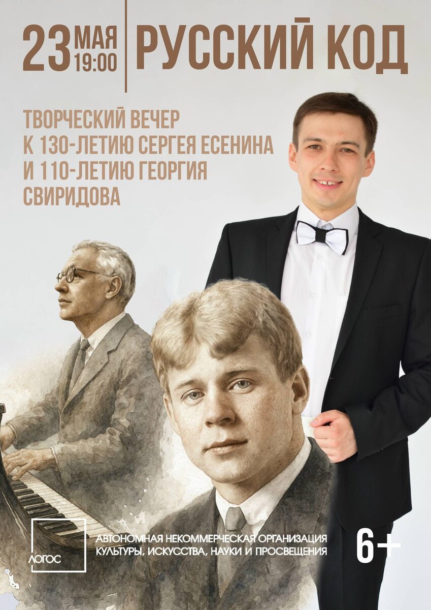 Встреча двух гениев русской души — поэта Сергея Есенина и композитора Георгия Свиридова. Прозвучат фрагменты вокальных циклов Свиридова и русские народные песни. Специальные гости из Новосибирска. Начало: 23 мая 2026 19:00 Стоимость: Не указана Адрес: г Омск, ул Рождественского, д 2/1 Организатор: https://vk.com/public227196844 ✨ 🇷🇺 «РУССКИЙ КОД» 🇷🇺✨ Творческий вечер к 130-летию Сергея Есенина и 110-летию Георгия Свиридова В тёплые майские дни, когда сама природа дышит есенинской лирикой, под величественные своды [club221773097|Лютеранской церкви] вновь приходит большая музыка. 🎶 23 мая (суббота) мы приглашаем вас на удивительную встречу двух гениев русской души — поэта Сергея Есенина и композитора Георгия Свиридова, чьи юбилеи переплелись в этом... #общество_люди Узнать подробности, адрес или записаться на событие.