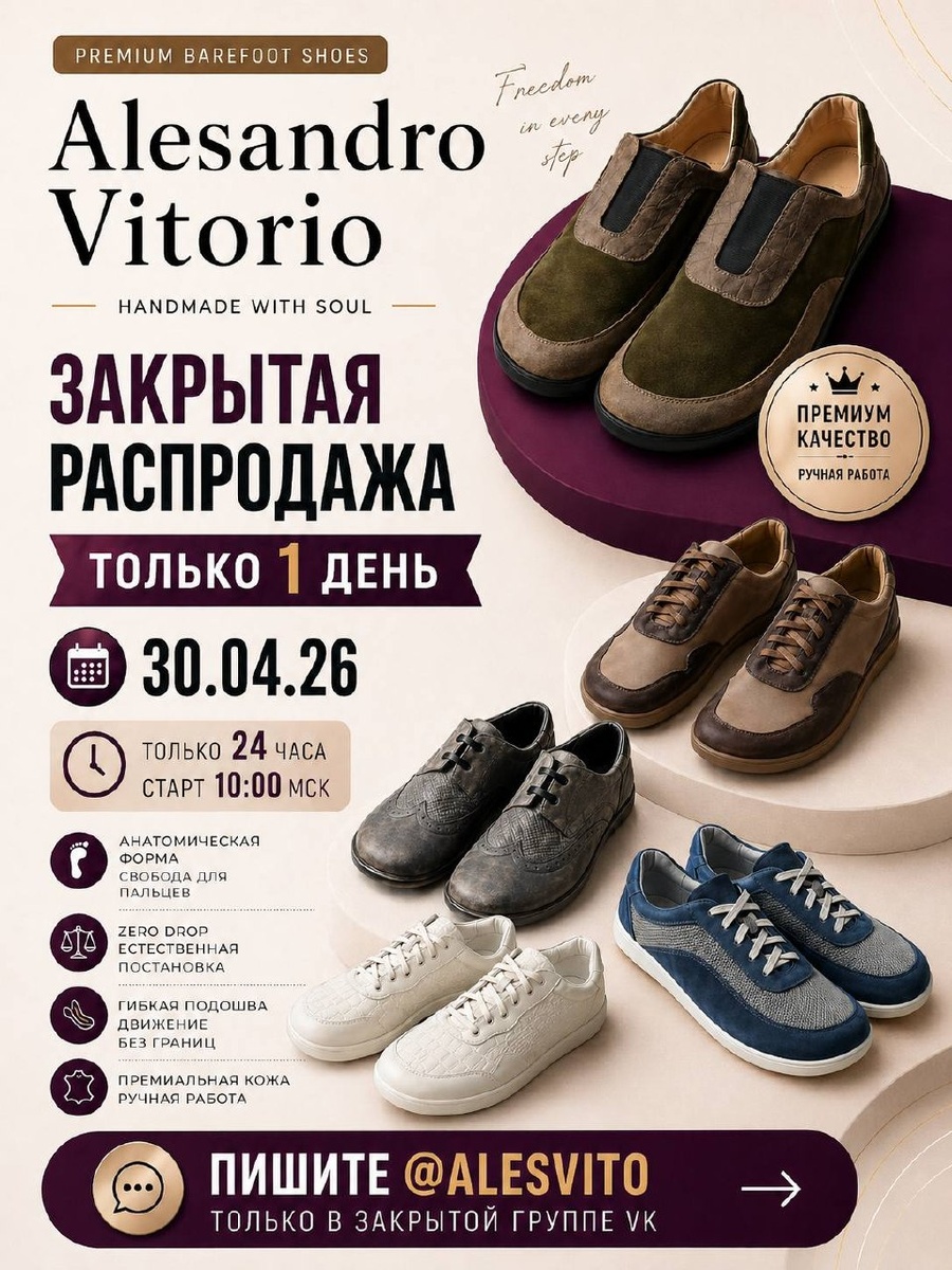 🔥 Закрытая распродажа Alesandro Vitorio 30.04.2026 Если вы с нами давно, вы знаете, как это происходит: это не “скидки ради галочки”. Это пары в наличии. Часто последние в своём размере. Иногда вообще единственные. И да, они уходят быстрее, чем вы успеваете написать: “а 38 ещё есть?” ⏳ Только 24 часа ⏳ Только в закрытой группе VK и в нашем закрытом telegram канале Старт 30.04 в 10:00 (МСК) Что сделать сегодня, если не хотите остаться “в следующий раз”: ✔ Подписаться на закрытую группу распродажи VK https://vk.com/invite/H3nt9z4 ✔ Измерить стопу (потом будет не до этого) как сделать замер смотрите следующий пост ✔ Поставить напоминание на 10:00 по Мск В момент старта выбираете пару и пишите менеджеру @alesvito Распродажа только 24 часа. Без брони. Без обмена. Без возврата. Зато с тем самым ощущением: “я успел(а)”. Кто успел тот и носит! Скоро начнётся🛍️