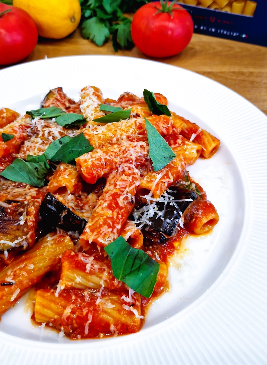 Это не просто паста. Это блюдо, в котором Сицилия умещается в одной тарелке. Помидоры, баклажаны, чеснок, базилик, сыр — список скромный, но результат обезоруживает. Шелковистые, пропитанные соусом баклажаны, сладкая с лёгкой остринкой томатная основа, плотные трубочки пасты, которые держат каждый слой вкуса. Солёная глубина сыра, свежий выдох базилика в финале. Приятного аппетита!