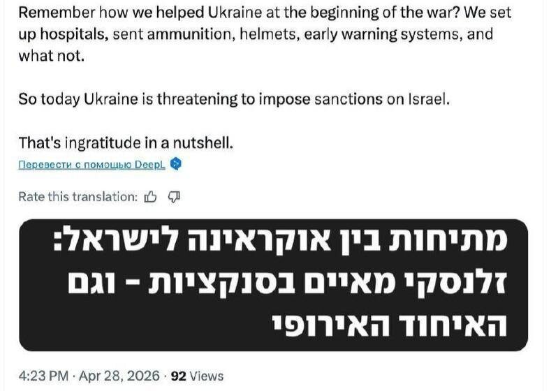 "Для Украины мы создавали больницы, отправляли боеприпасы, каски и многое другое. А теперь Украина угрожает ввести санкции против Израиля. Вот вам и благодарность", - заявила глава комитета по вопросам труда и социального обеспечения Израиля Вольдигер ‼️Дипломатический кризис между странами спровоцировал заход в порт Хайфы сухогруза Panormitis с 30 тыс. тонн зерна. Киев назвал груз «украденным» и в ультимативной форме потребовал его ареста. Подпишись в МАХ