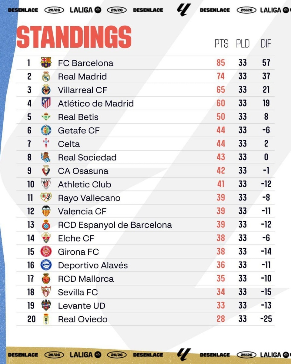 🇪🇸 Турнирная таблица Ла Лиги после 32-го тура.