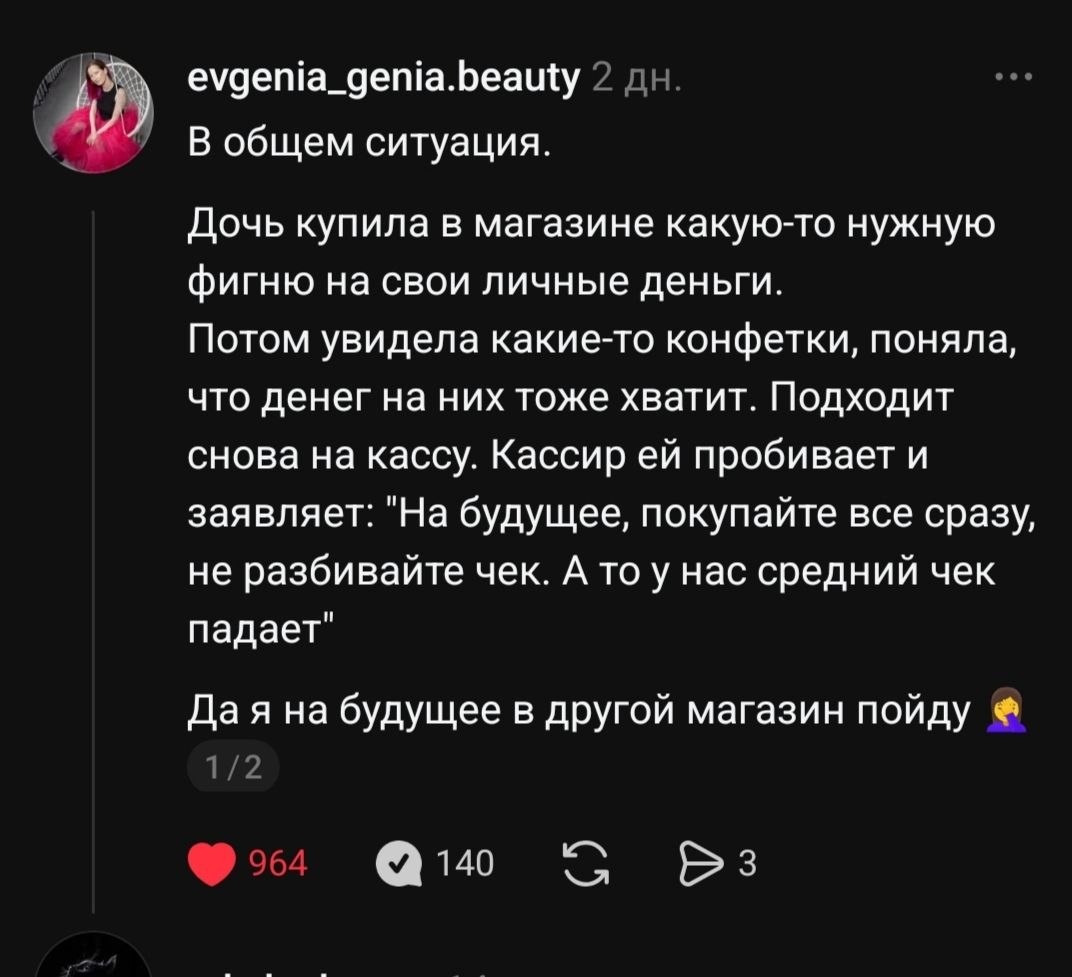 Некоторые возмущались. Кто-то защищал продавца - мол его скорее всего начальство затюкало и человек не сдержался (вполне допускаю, в принципе). Нашелся один пирожочек, который обвинил меня, что слишком легко живу - никто не штрафует и премии не лишает 😂 Буквально жизни не нюхала. Штрафов мне и правда начальство не выписывает 😂 Только вот, если я так начну клиентам отвечать я вообще без еды останусь, не то что средний чек упадёт. Так что осталась я при своём мнении: вежливое общение наше все. Кстати, на будущее, если хочешь какой-то мелкий заказ - не стесняйся 😏 Мой начальник считает, что средний чек - не проблема клиента. А ты как думаешь, уместны такие замечания в магазине? Особенно на спонтанные детские траты. Подбор ухода тут Просто спросить - в сообщеня каналу