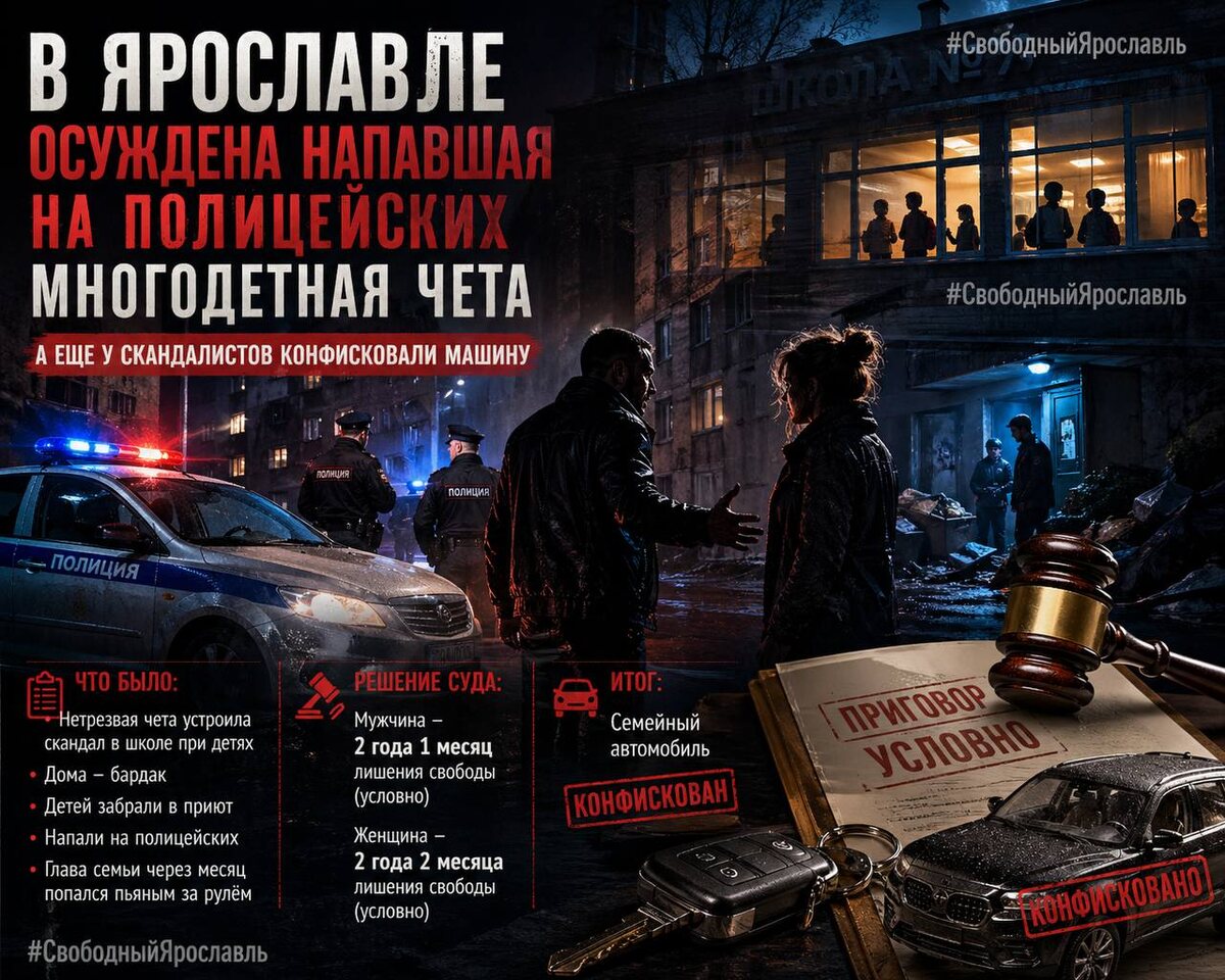 История, где «погорячились» — это мягко сказано. В октябре прошлого года в одну из школ Ярославля пришла нетрезвая многодетная пара. Итог — конфликт с завучем прямо при детях, с матами и криками. Через полчаса к ним уже приехали сотрудники ПДН. Причины понятны: — родители в состоянии опьянения — детей забрали из школы со скандалом — дома — полный бардак Решение — временно изъять детей и отправить в приют. Но и на этом не остановились… Родители напали на полицейских. А дальше — как по сценарию: спустя месяц глава семьи попадается пьяным за рулём 🚗💨 ⚖️ Итог: — мужчина: 2 года 1 месяц лишения свободы (условно) — женщина: 2 года 2 месяца (условно) — машина конфискована ❗️Вот такая «семейная ответственность». 👉 Вопрос к вам: это мягкое наказание или всё по закону? #Ярославль #новости #происшествия #суд #полиция #алкоголь #дети #скандал #Россия #закон #общество #СвободныйЯрославль 🔥 Подписаться | Предложить новость 📱 Чат Свободный Ярославль 📱 Не грузит ? Мы в MAX 🚀🚀