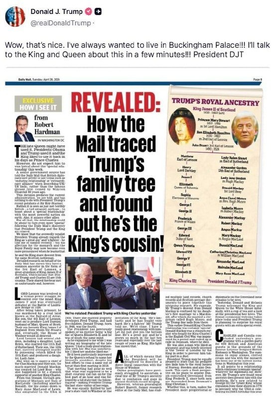 визитом в Вашингтоне. "Я всегда хотел жить в Букингемском дворце!!! Обсудим это с королем и королевой через несколько минут", - написал он в соцсети Truth Social. Так Трамп отреагировал на статью газеты Daily Mail, в которой утверждалось, что он и британский монарх приходятся друг другу 16-юродными братьями. Подпишись в МАХ