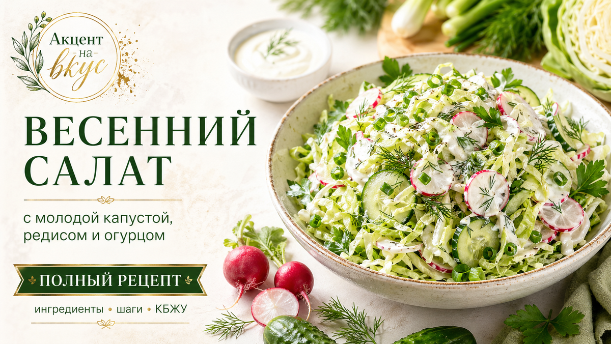 Весенний салат с молодой капустой, редисом и огурцом — это простой, свежий и очень лёгкий рецепт на каждый день. Он отлично подходит к мясу, курице, рыбе, молодой картошке или может быть самостоятельным перекусом. Салат получается хрустящим, сочным и ароматным. Молодая капуста даёт нежную основу, редис добавляет лёгкую остринку, огурец — свежесть, а зелень делает вкус ярче. 15–20 минут 4 порции Очень легко Молодую капусту промойте, уберите верхние листы, если они повреждены. Тонко нашинкуйте капусту ножом. Переложите капусту в глубокую миску, слегка посолите и аккуратно помните руками буквально 20–30 секунд. Сильно мять не нужно — молодая капуста и так нежная. Редис хорошо промойте, удалите хвостики и нарежьте тонкими кружочками или полукружочками. Чем тоньше нарезка, тем нежнее будет салат. Огурцы промойте и нарежьте тонкими полукружочками или соломкой. Если кожура плотная, её можно частично снять. Добавьте огурцы в миску к капусте и редису. Зелёный лук, укроп и петрушку мелко нарежьт